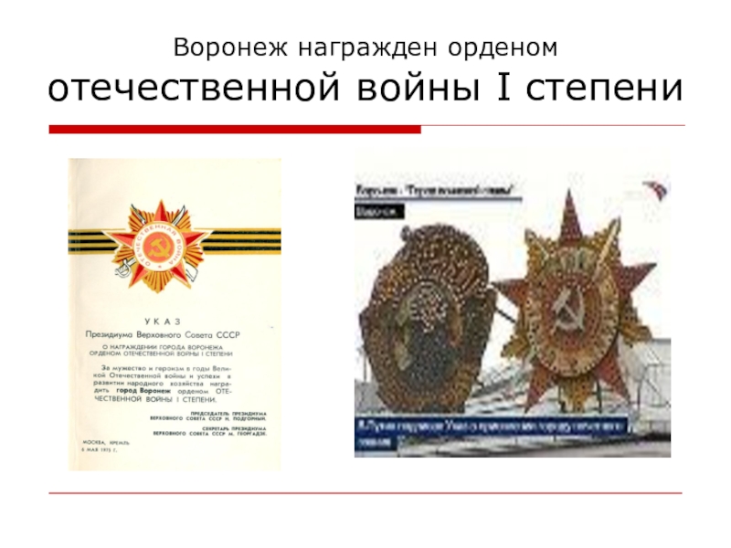 Слайд 43Воронеж награжден орденом отечественной войны I степени