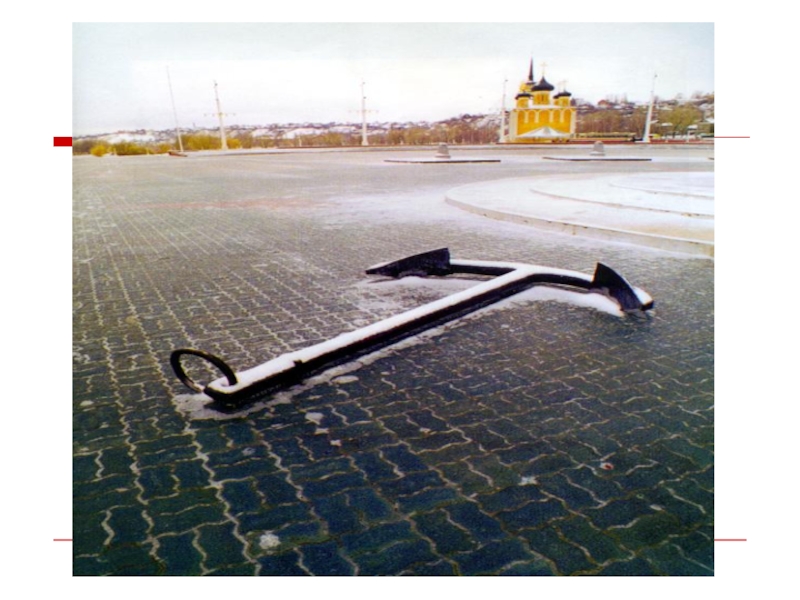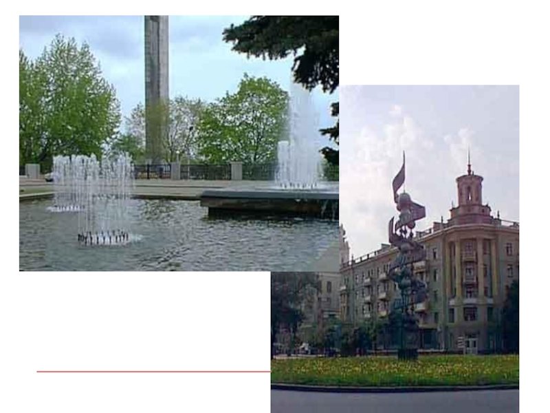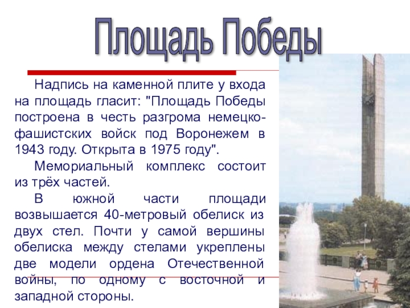 Слайд 40Надпись на каменной плите у входа на площадь гласит: "Площадь Победы