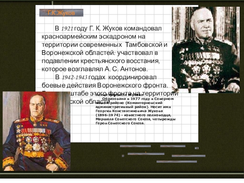 В 1921 году Г. К. Жуков командовал красноармейским эскадроном на территории современных Тамбовской и Воронежской областей: участвовал в подавлении крестьянского восстания, которое возглавлял А. С. Антонов.