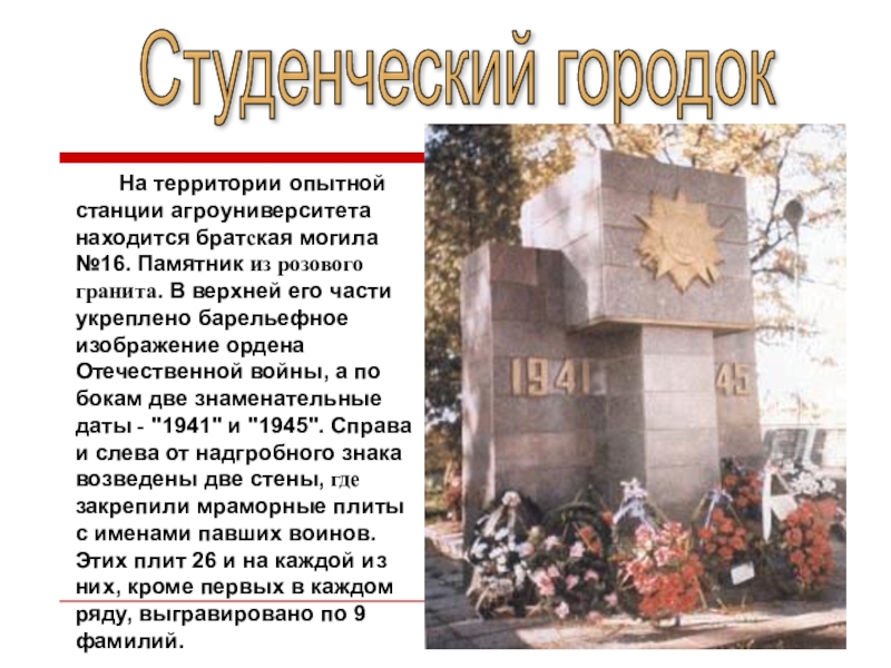 №16. Памятник из розового гранита. В верхней его части укреплено барельефное изображение ордена Отечественной войны, а по бокам две знаменательные даты - "1941" и "1945". Справа и слева от надгробного знака возведены две стены, где закрепили мраморные плиты с именами павших воинов. Этих плит 26 и на каждой из них, кроме первых в каждом ряду, выгравировано по 9 фамилий.