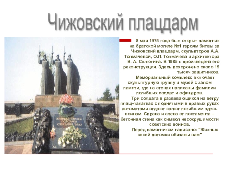 был открыт памятник на братской могиле №1 героям битвы за Чижовский плацдарм, скульпторов А.А. Толмачевой, О.П. Толмачева и архитектора В. А. Селютина. В 1985 г. произведена его реконструкция. Здесь похоронено около 15 тысяч защитников.