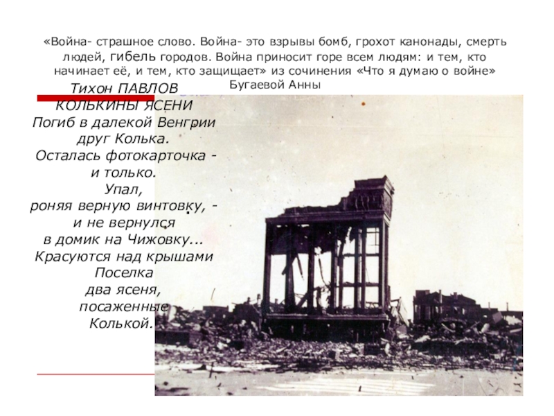 гибель городов. Война приносит горе всем людям: и тем, кто начинает её, и тем, кто защищает» из сочинения «Что я думаю о войне» Бугаевой Анны