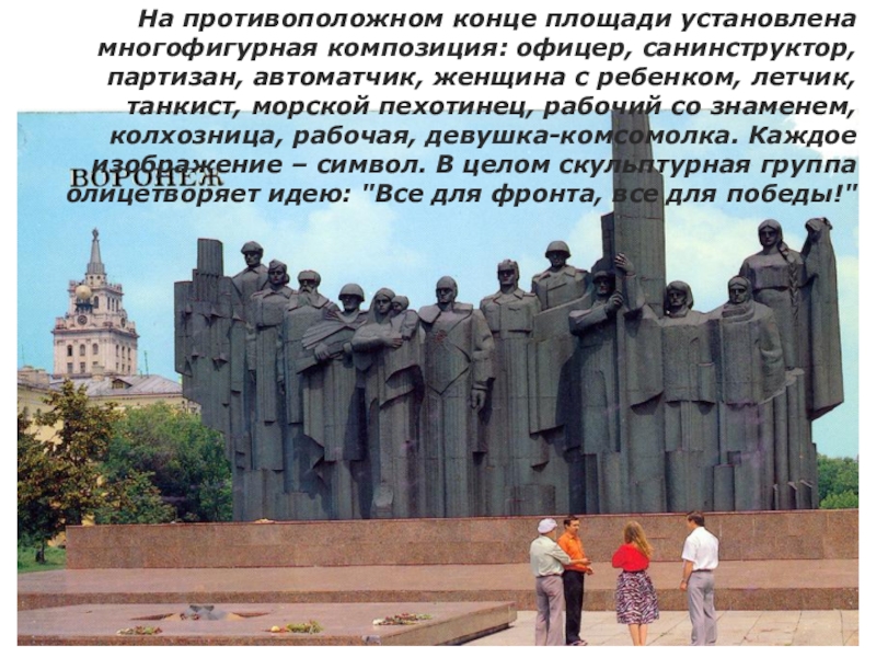 женщина с ребенком, летчик, танкист, морской пехотинец, рабочий со знаменем, колхозница, рабочая, девушка-комсомолка. Каждое изображение – символ. В целом скульптурная группа олицетворяет идею: "Все для фронта, все для победы!"