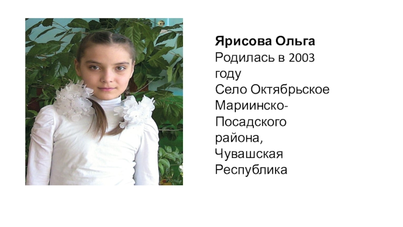Ярисова ОльгаРодилась в 2003 году Село Октябрьское Мариинско-Посадского района, Чувашская Республика