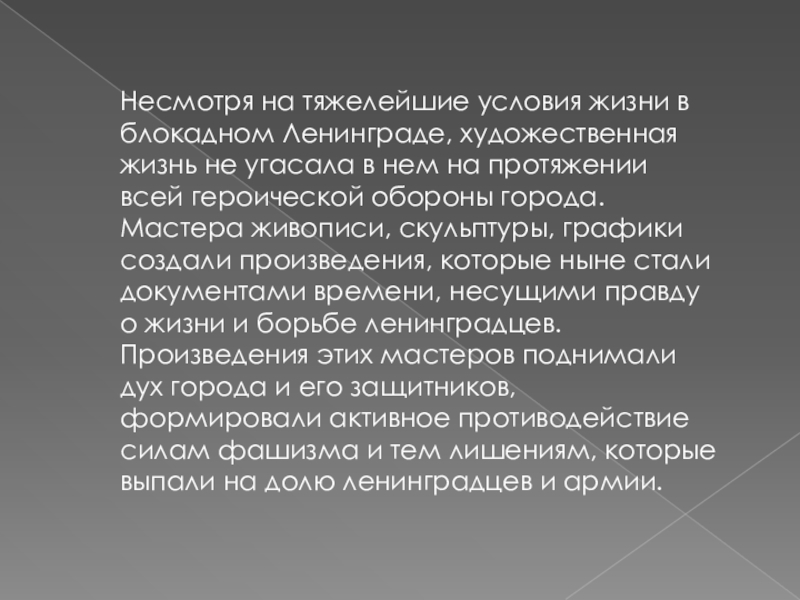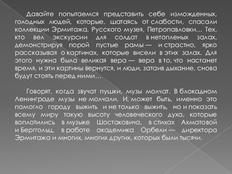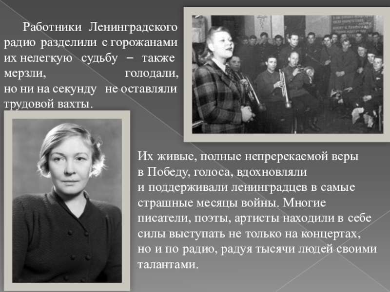Их живые, полные непререкаемой веры в Победу, голоса, вдохновляли и поддерживали ленинградцев в самые страшные месяцы войны. Многие писатели, поэты, артисты находили в себе силы выступать не только на концертах, но и по радио, радуя тысячи людей своими талантами.