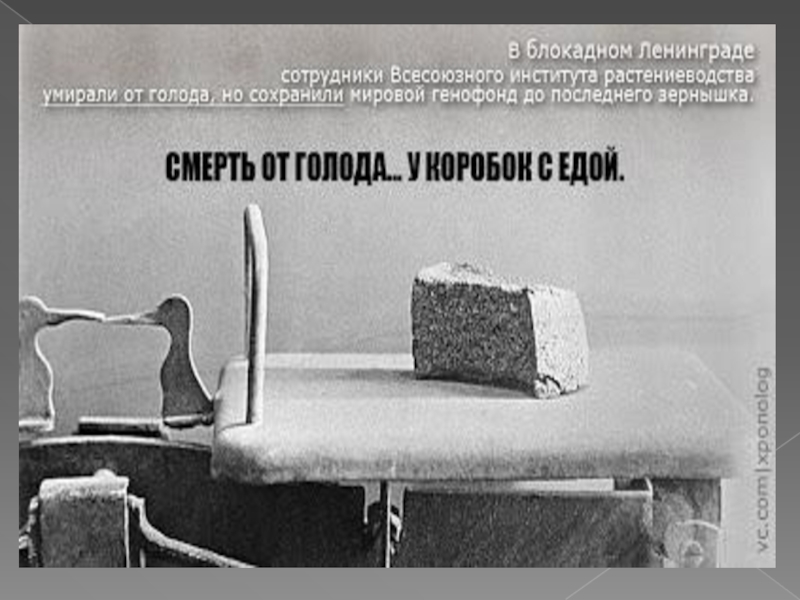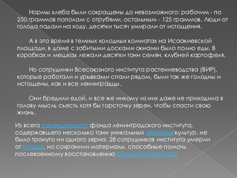 Из всего селекционного фонда ленинградского института, содержавшего несколько тонн уникальных зерновых культур, не было тронуто ни одного зерна. 28 сотрудников института умерли от голода, но сохранили материалы, способные помочь послевоенному восстановлению сельского хозяйства