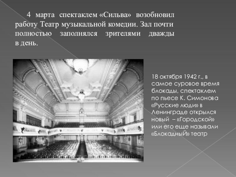 18 октября 1942 г., в самое суровое время блокады, спектаклем по пьесе К. Симонова«Русские люди» в Ленинграде открылся новый – «Городской» или его еще называли «БлокадныЙ» театр