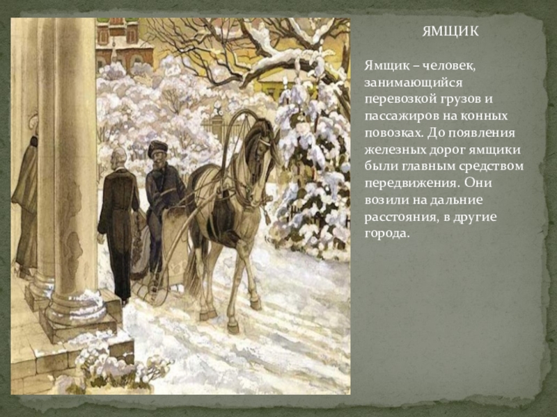 Ямщик – человек, занимающийся перевозкой грузов и пассажиров на конных повозках.