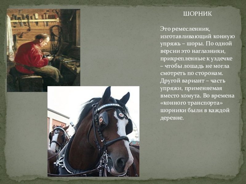 наглазники, прикрепленные к уздечке – чтобы лошадь не могла смотреть по сторонам. Другой вариант – часть упряжи, применяемая вместо хомута. Во времена «конного транспорта» шорники были в каждой деревне.