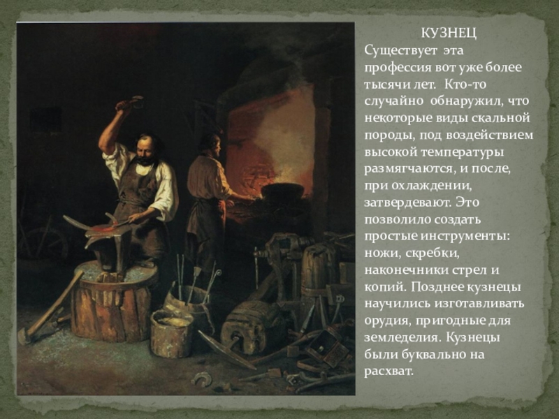 что некоторые виды скальной породы, под воздействием высокой температуры размягчаются, и после, при охлаждении, затвердевают. Это позволило создать простые инструменты: ножи, скребки, наконечники стрел и копий. Позднее кузнецы научились изготавливать орудия, пригодные для земледелия. Кузнецы были буквально на расхват.
