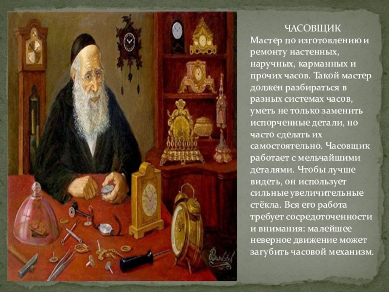 Такой мастер должен разбираться в разных системах часов, уметь не только заменить испорченные детали, но часто сделать их самостоятельно. Часовщик работает с мельчайшими деталями. Чтобы лучше видеть, он использует сильные увеличительные стёкла. Вся его работа требует сосредоточенности и внимания: малейшее неверное движение может загубить часовой механизм.