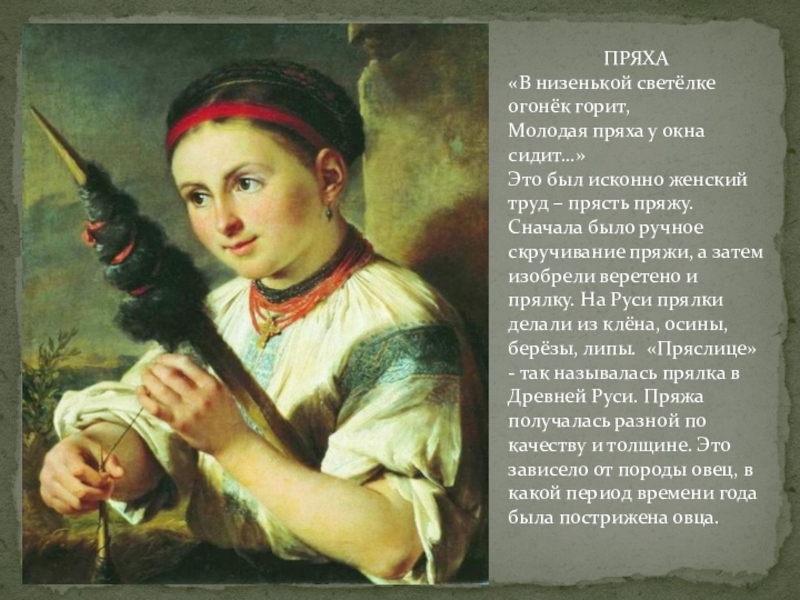 женский труд – прясть пряжу. Сначала было ручное скручивание пряжи, а затем изобрели веретено и прялку. На Руси прялки делали из клёна, осины, берёзы, липы. «Пряслице» - так называлась прялка в Древней Руси. Пряжа получалась разной по качеству и толщине. Это зависело от породы овец, в какой период времени года была пострижена овца.