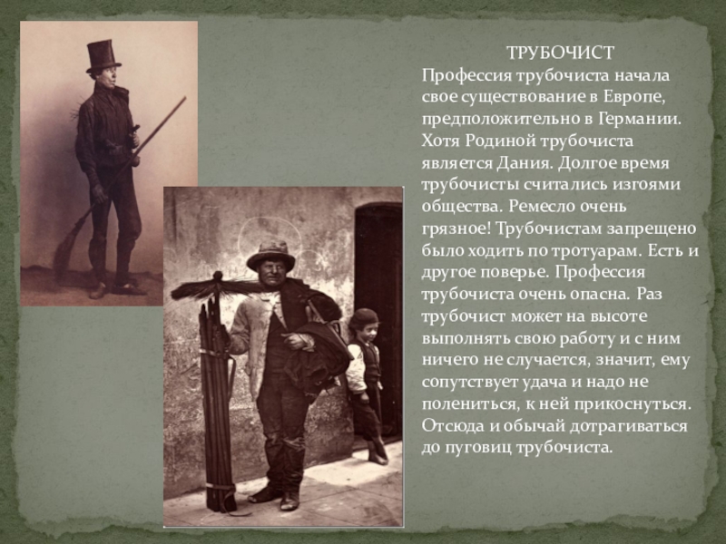 Профессия трубочиста начала свое существование в Европе, предположительно в Германии. Хотя