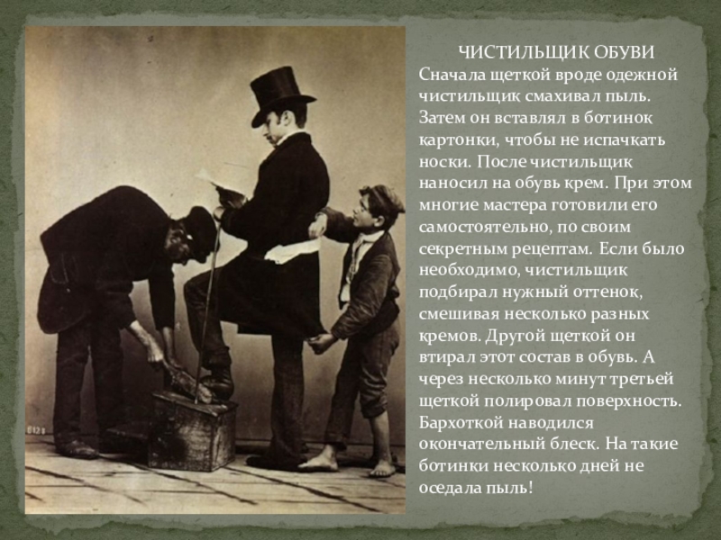 в ботинок картонки, чтобы не испачкать носки. После чистильщик наносил на обувь крем. При этом многие мастера готовили его самостоятельно, по своим секретным рецептам. Если было необходимо, чистильщик подбирал нужный оттенок, смешивая несколько разных кремов. Другой щеткой он втирал этот состав в обувь. А через несколько минут третьей щеткой полировал поверхность. Бархоткой наводился окончательный блеск. На такие ботинки несколько дней не оседала пыль!