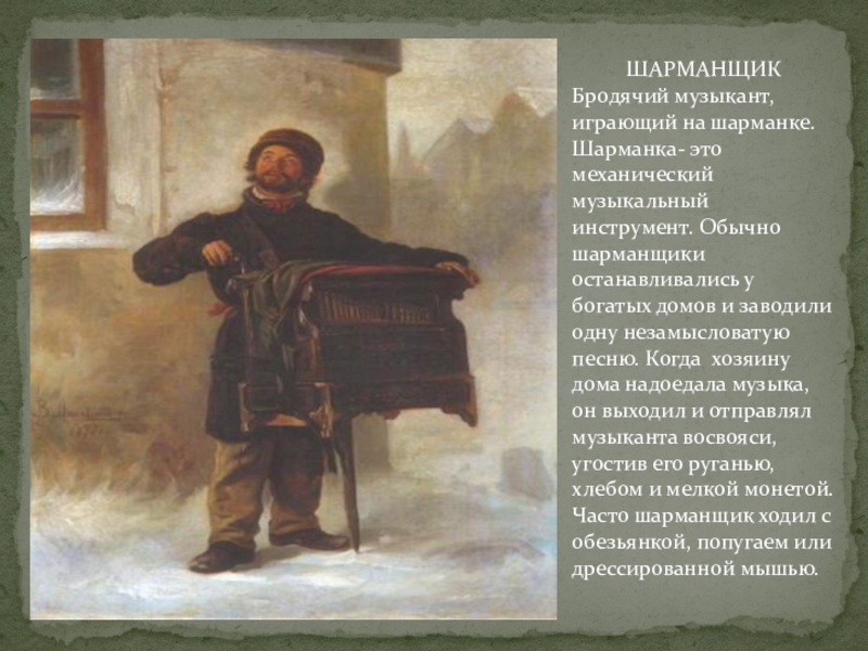 Бродячий музыкант, играющий на шарманке. Шарманка- это механический музыкальный инструмент. Обычно