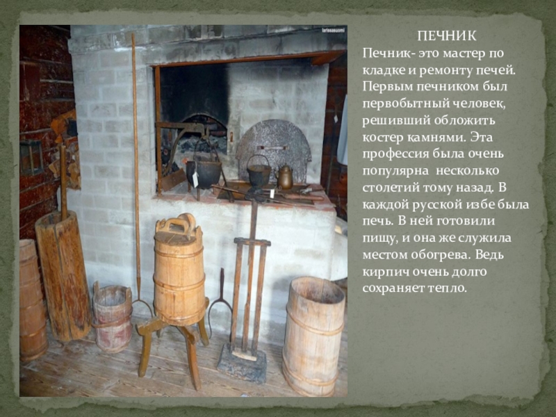 первобытный человек, решивший обложить костер камнями. Эта профессия была очень популярна несколько столетий тому назад. В каждой русской избе была печь. В ней готовили пищу, и она же служила местом обогрева. Ведь кирпич очень долго сохраняет тепло.
