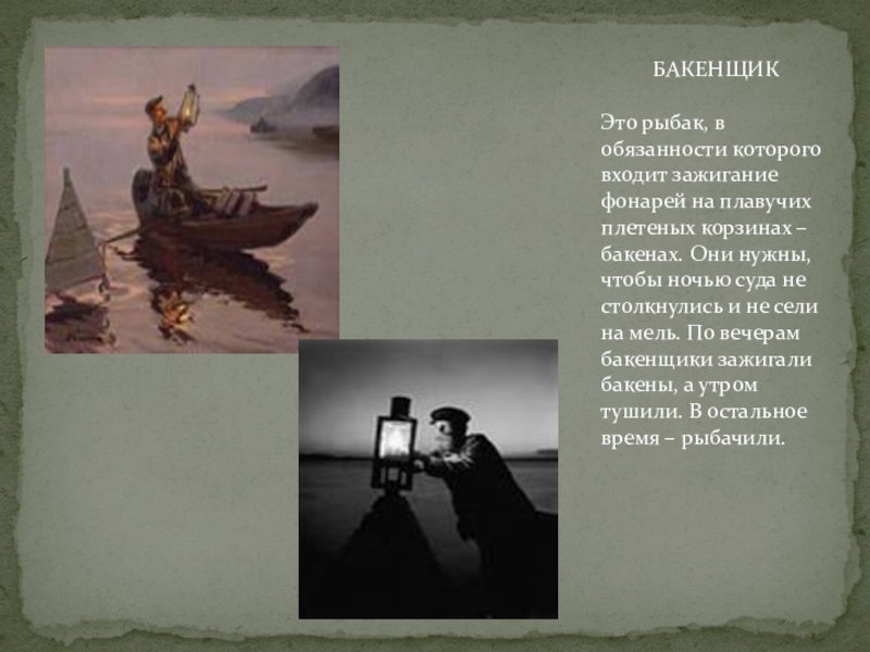 корзинах – бакенах. Они нужны, чтобы ночью суда не столкнулись и не сели на мель. По вечерам бакенщики зажигали бакены, а утром тушили. В остальное время – рыбачили.