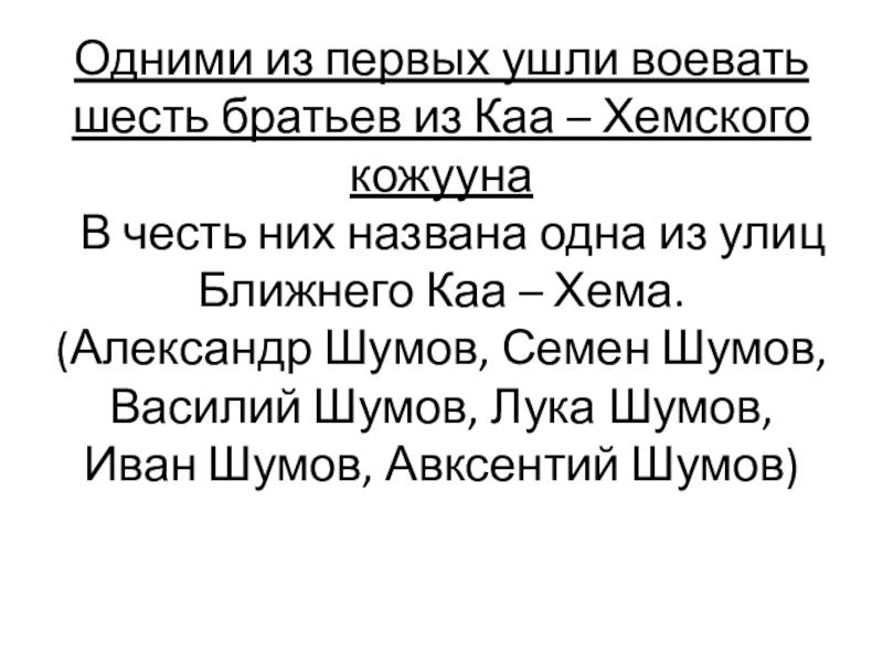 кожууна В честь них названа одна из улиц Ближнего Каа – Хема. (Александр Шумов, Семен Шумов, Василий Шумов, Лука Шумов, Иван Шумов, Авксентий Шумов)