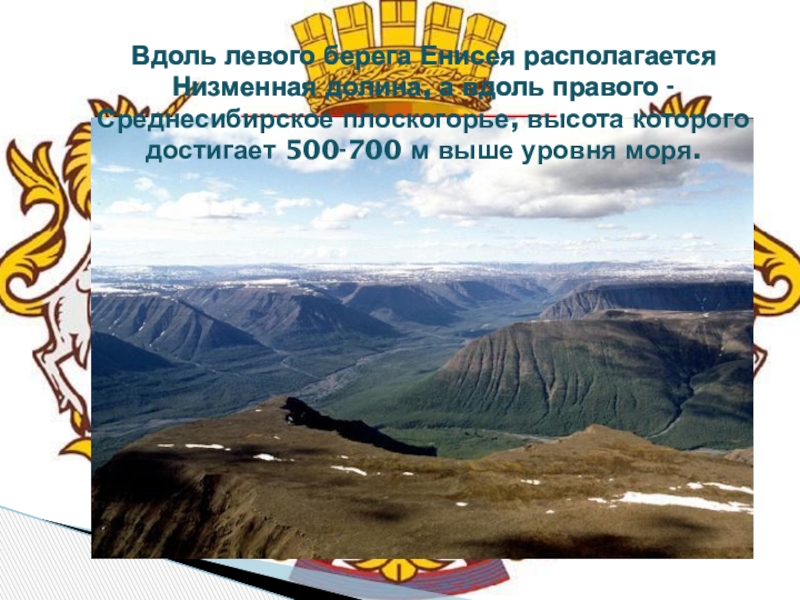 Слайд 3 Вдоль левого берега Енисея располагается Низменная долина, а вдоль