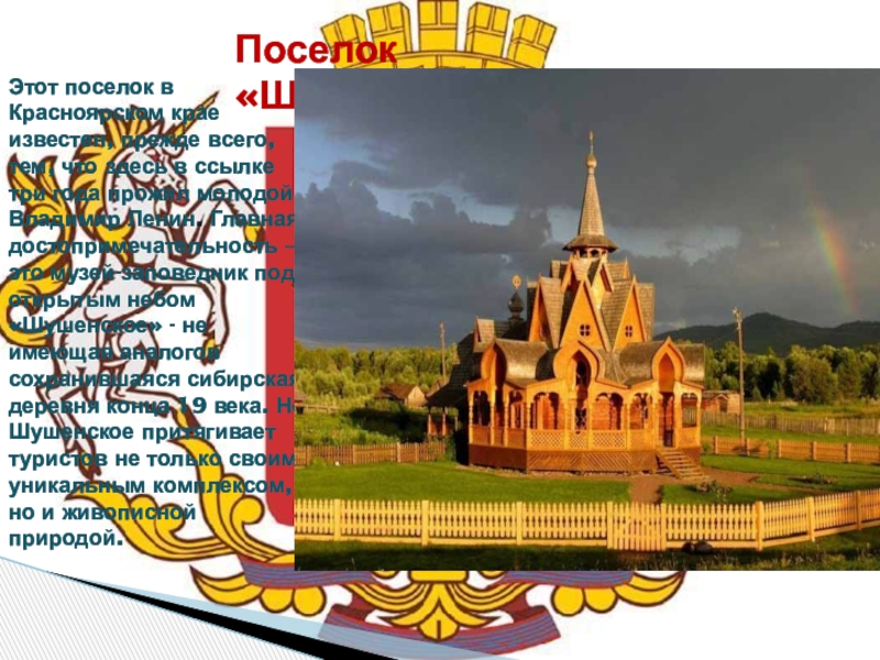здесь в ссылке три года прожил молодой Владимир Ленин. Главная достопримечательность — это музей-заповедник под открытым небом «Шушенское» - не имеющая аналогов сохранившаяся сибирская деревня конца 19 века. Но Шушенское притягивает туристов не только своим уникальным комплексом, но и живописной природой.