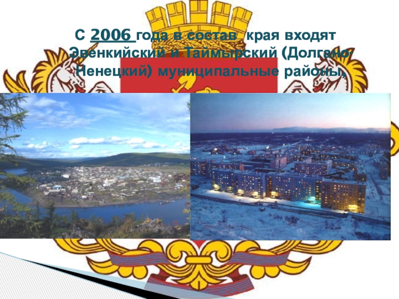 Слайд 7С 2006 года в состав края входят Эвенкийский и Таймырский (Долгано-Ненецкий) муниципальные