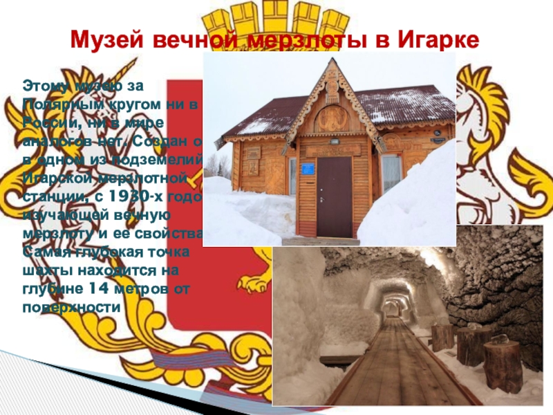 России, ни в мире аналогов нет. Создан он в одном из подземелий Игарской мерзлотной станции, с 1930-х годов изучающей вечную мерзлоту и ее свойства. Самая глубокая точка шахты находится на глубине 14 метров от поверхности