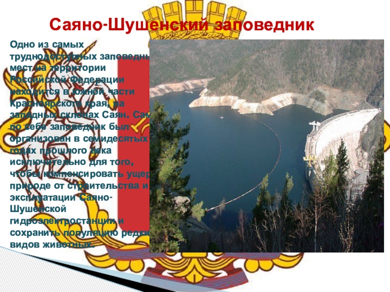 находится в южной части Красноярского края, на западных склонах Саян. Сам по себе заповедник был организован в семидесятых годах прошлого века исключительно для того, чтобы компенсировать ущерб природе от строительства и эксплуатации Саяно-Шушенской гидроэлектростанции и сохранить популяцию редких видов животных.