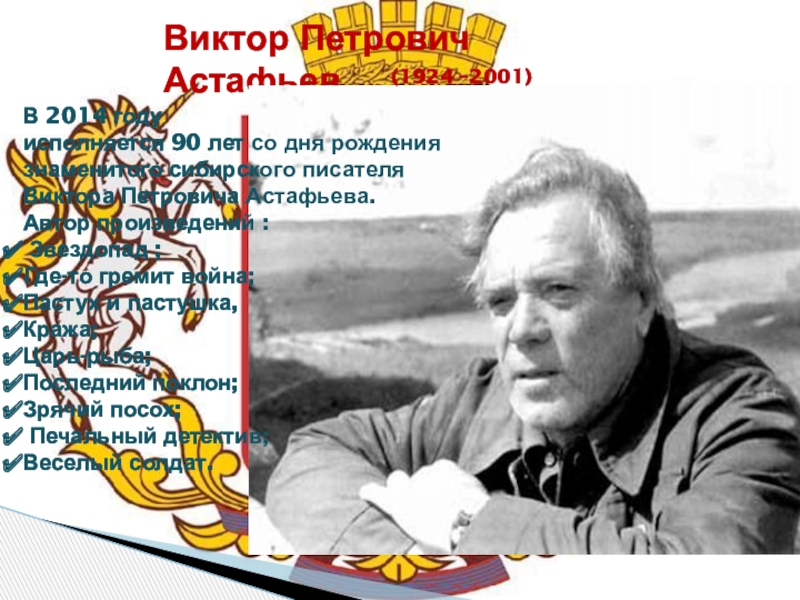 В 2014 году исполняется 90 лет со дня рождения знаменитого сибирского писателя Виктора Петровича Астафьева. Автор произведений