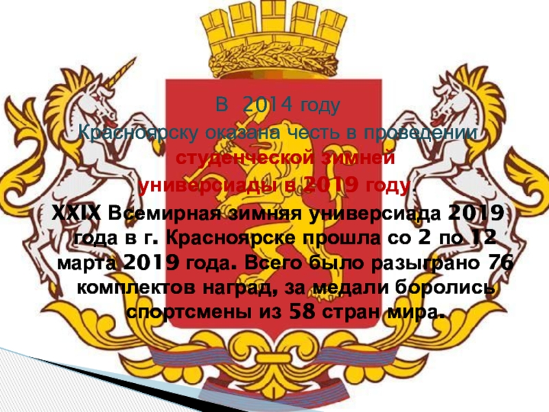 XXIX Всемирная зимняя универсиада 2019 года в г. Красноярске прошла со 2 по 12 марта 2019 года. Всего было разыграно 76 комплектов наград, за медали боролись спортсмены из 58 стран мира.