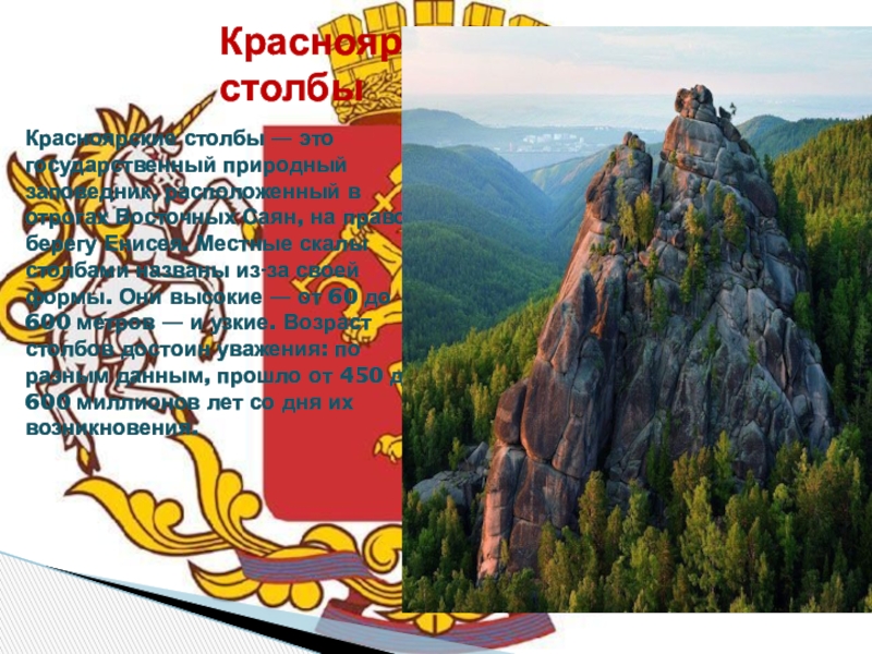 Восточных Саян, на правом берегу Енисея. Местные скалы столбами названы из-за своей формы. Они высокие — от 60 до 600 метров — и узкие. Возраст столбов достоин уважения: по разным данным, прошло от 450 до 600 миллионов лет со дня их возникновения.