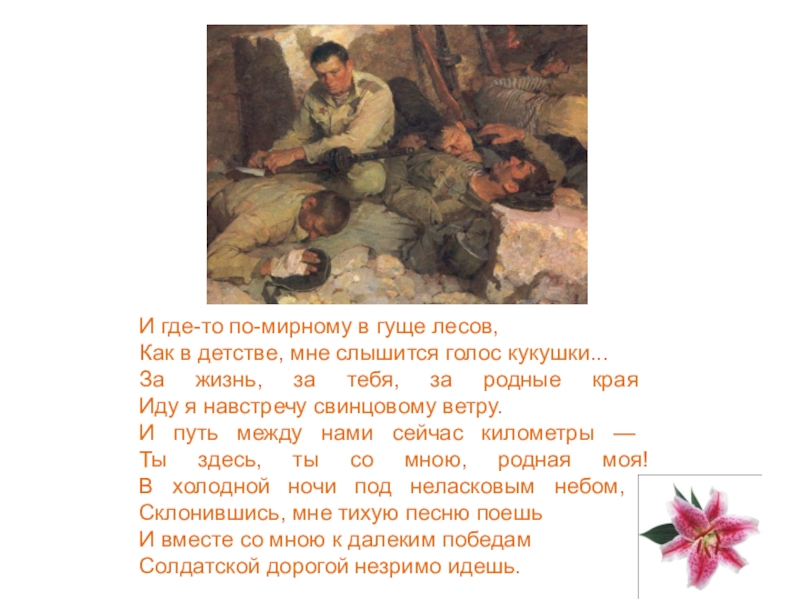 Слайд 18Поют гитар походных струны в тайге, в горах, среди морей...
