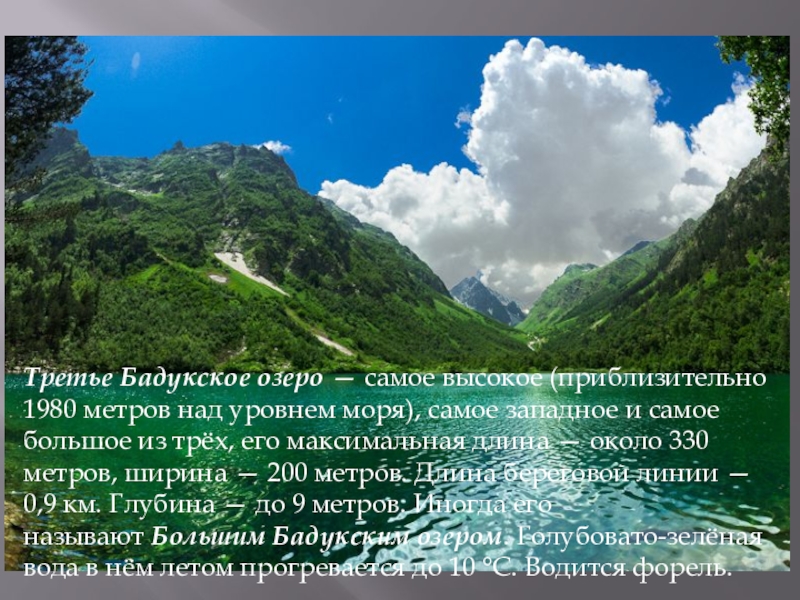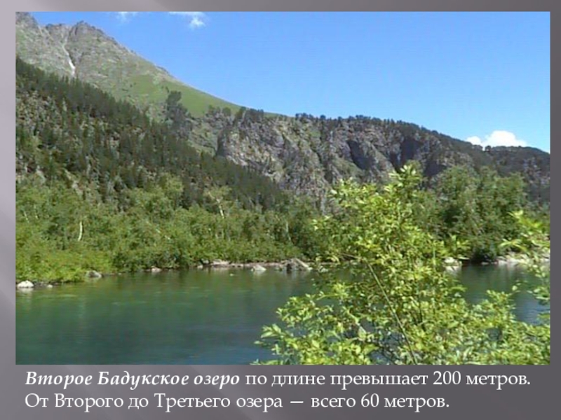 Первое Бадукское озеро — самое нижнее по течению реки и самое маленькое из трёх, его длина всего около 80 метров. Глубина 4,5 метра. Температура воды даже летом не поднимается выше 5 °C. Расстояние от него до Второго озера — 260 метров по прямой.