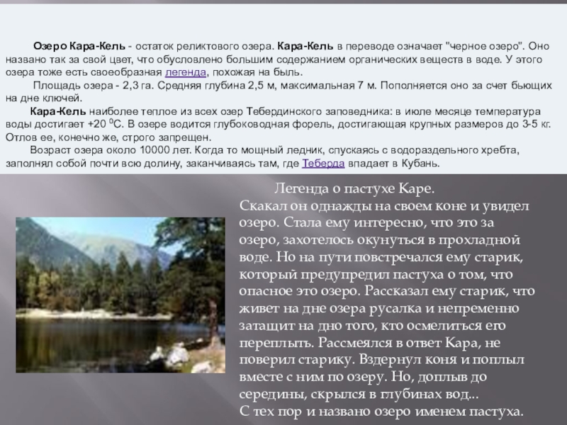 Скакал он однажды на своем коне и увидел озеро. Стала ему интересно, что это за озеро, захотелось окунуться в прохладной воде. Но на пути повстречался ему старик, который предупредил пастуха о том, что опасное это озеро. Рассказал ему старик, что живет на дне озера русалка и непременно затащит на дно того, кто осмелиться его переплыть. Рассмеялся в ответ Кара, не поверил старику. Вздернул коня и поплыл вместе с ним по озеру. Но, доплыв до середины, скрылся в глубинах вод...