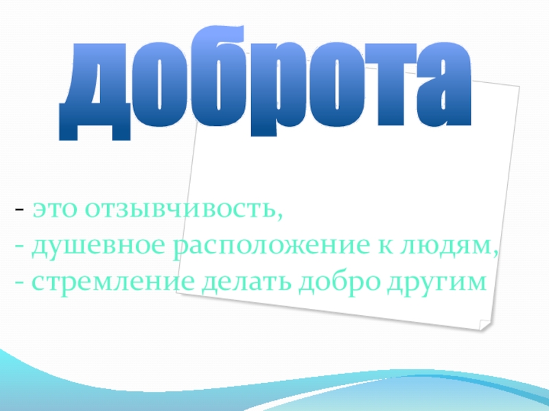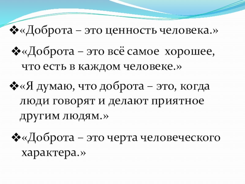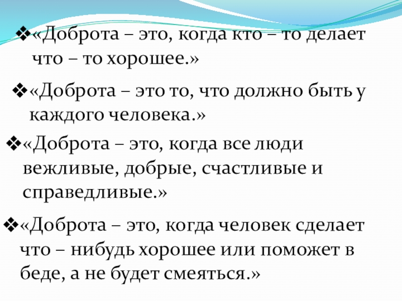 «Доброта – это, когда человек сделает что – нибудь хорошее или поможет в беде, а не будет смеяться.»