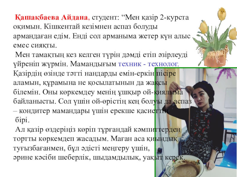 Слайд 7 Қашақбаева Айдана, студент: “Мен қазір 2-курста оқимын. Кішкентай кезімнен аспаз