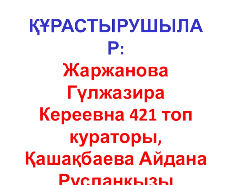 ҚҰРАСТЫРУШЫЛАР:Жаржанова Гүлжазира Кереевна 421 топ кураторы,Қашақбаева Айдана Русланқызы 421 топ студенті