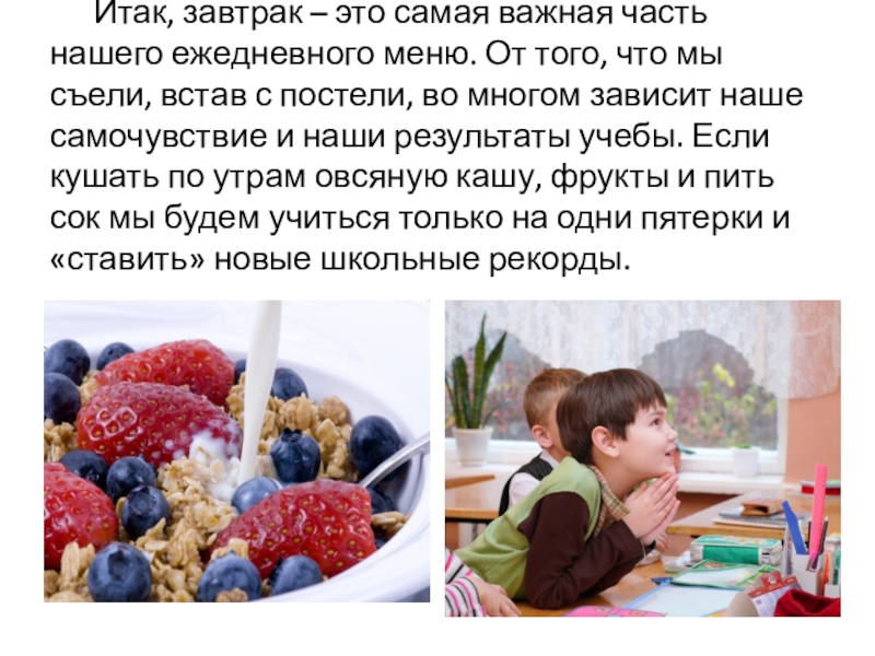 Слайд 8 Итак, завтрак – это самая важная часть нашего ежедневного меню. От