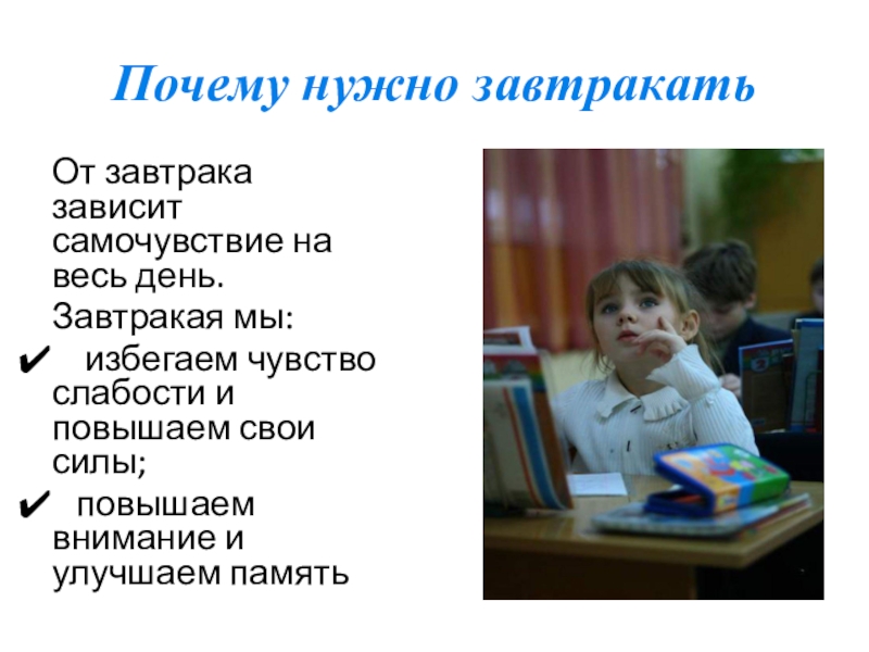 Почему нужно завтракатьОт завтрака зависит самочувствие на весь день.Завтракая мы: избегаем чувство слабости и повышаем свои силы; повышаем внимание и улучшаем память