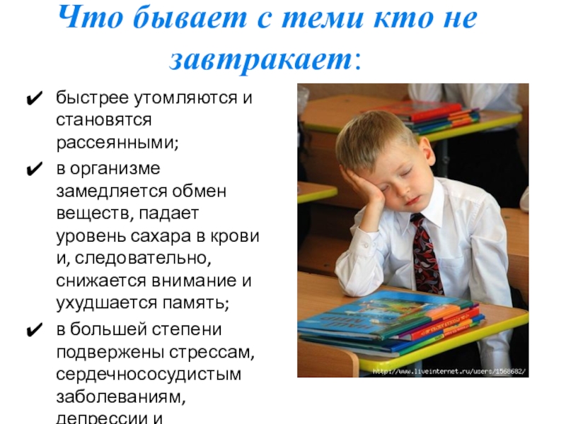 Что бывает с теми кто не завтракает: быстрее утомляются и становятся рассеянными;в организме замедляется обмен веществ, падает