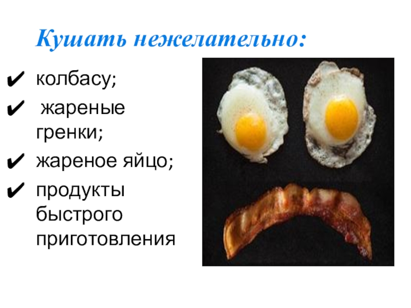 Кушать нежелательно:колбасу; жареные гренки;жареное яйцо;продукты быстрого приготовления