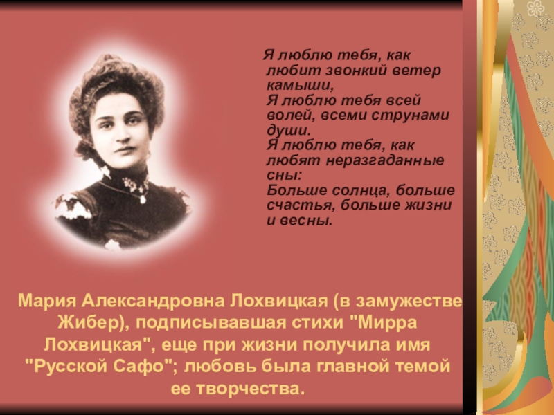 Слайд 55Мария Александровна Лохвицкая (в замужестве Жибер), подписывавшая стихи "Мирра Лохвицкая", еще