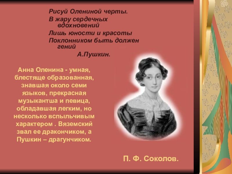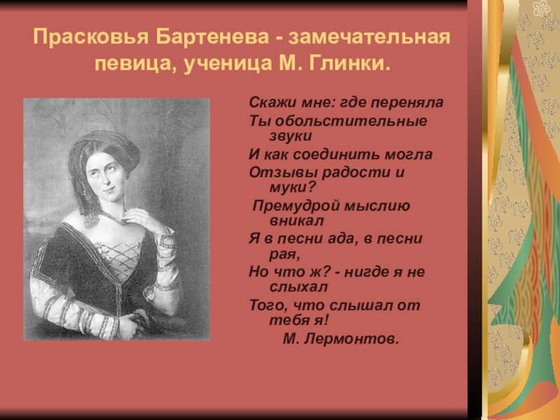 Слайд 9Прасковья Бартенева - замечательная певица, ученица М. Глинки.