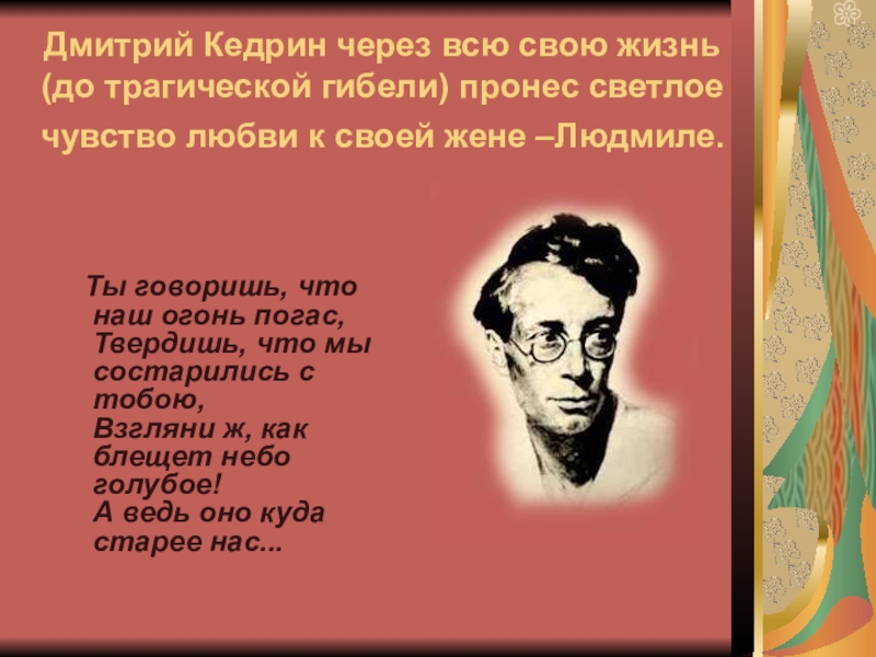 Слайд 57Дмитрий Кедрин через всю свою жизнь (до трагической гибели) пронес светлое