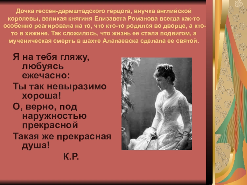 Слайд 8Дочка гессен-дармштадского герцога, внучка английской королевы, великая княгиня Елизавета Романова всегда