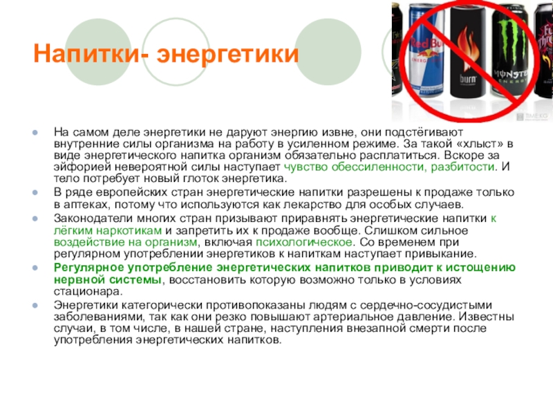 Законодатели многих стран призывают приравнять энергетические напитки к лёгким наркотикам и запретить их к продаже вообще. Слишком сильное воздействие на организм, включая психологическое. Со временем при регулярном употреблении энергетиков к напиткам наступает привыкание.