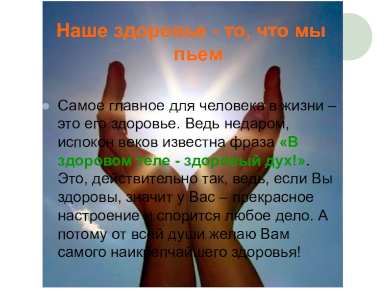 жизни – это его здоровье. Ведь недаром, испокон веков известна фраза «В здоровом теле - здоровый дух!». Это, действительно так, ведь, если Вы здоровы, значит у Вас – прекрасное настроение и спорится любое дело. А потому от всей души желаю Вам самого наикрепчайшего здоровья!