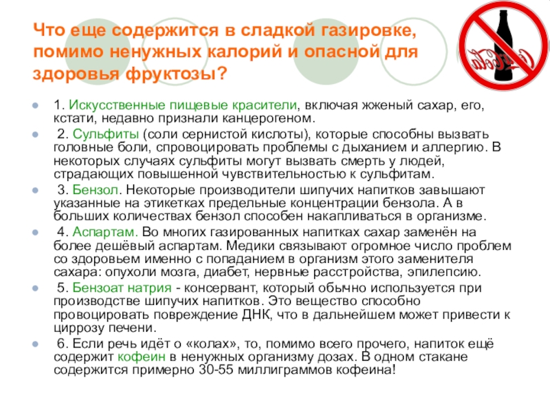 Слайд 13Что еще содержится в сладкой газировке, помимо ненужных калорий и опасной