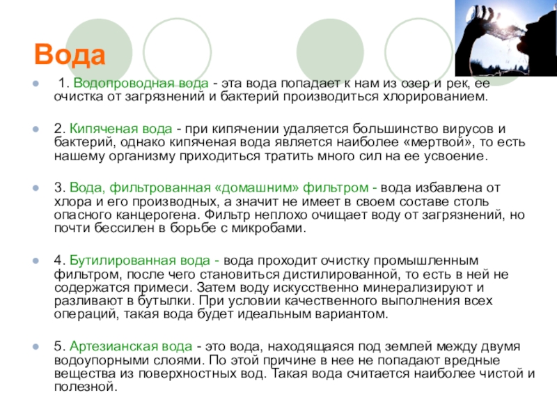 2. Кипяченая вода - при кипячении удаляется большинство вирусов и бактерий, однако кипяченая вода является наиболее «мертвой», то есть нашему организму приходиться тратить много сил на ее усвоение.
