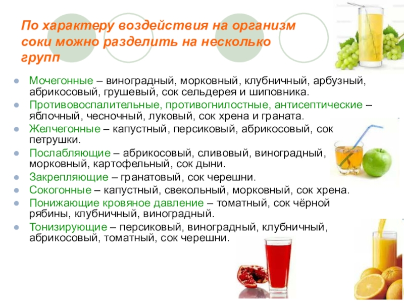 По характеру воздействия на организм соки можно разделить на несколько групп