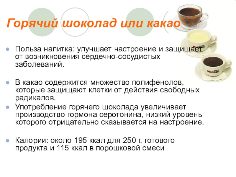 В какао содержится множество полифенолов, которые защищают клетки от действия свободных радикалов.